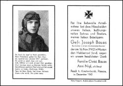 Gefallener 2. Weltkrieg; Bordfunker in einem Sturmkampfgeschwader; Varter: Christian Baues; Braut: Anni Nigl aus Passau; Druck in Korschenbroich |