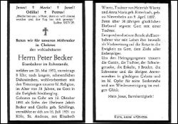 Eisenbahner i.R.; Eltern: Jakob Becker u. Cäcilia geb. Schillings; ∞ 16.7.1921 in Köln Elisabeth Wiertz, Tochter von Heinrich Wiertz u. Anna geb. Ritterbach, geb. zu Nievenheim 9.4.1897; 1 Tochter; Druck in Anstel |