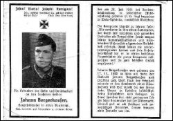 Gefallener 2. Weltkrieg, gefallen "bei Bandenbekämpfung" in Wola-Rytelska, nordöstl. Warschau; Eltern: Johann Bergerhausen u. Christine geb. Wolf; erlernte Handwerk des Eisendrehers; zuletzt b. der Fa. Gebr. Weyer in Opladen |