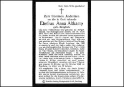 Besuch des Lehrerseminars in Xanten, danach mehrere Jahre im Schuldienst; ∞ 15.8.1907 Oberstudienrat Karl Altkamp; 35 J. Ehe; 1 Tochter: Ingeborg, die 1933 promovierte u. 1837 ∞ Dr.phil. Robert Schneider, Assistent am philos. Semonar der Uni Bonn; leistete karitative Arbeit in Arnsberg |