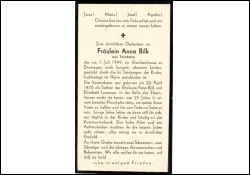 Langes, schweres Leiden; Eltern: Peter (Laurenz Peter Joseph) Bilk u. Elisabeth geb. Lorenzen; 25 J. in fremdem Haushalt tätig, danach bei ihrem Vater bis zu dessen Tod |