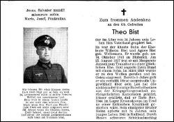 Gefallener 2. Weltkrieg; Eltern: Wilhelm Bist u. Agnes geb. Wellemsen; ∞ 25.8.1937 Margarete Jansen; 1 Sohn; März 1940 Einberufung; im Osten eingesetzt; galt bereits 5 J. als vermisst; rückgekehrte Kameraden brachten Gewissheit über seinen Tod; jüngster Bruder Heinz bereits 1941 in Russland gefallen; 2. Seite fehlt |