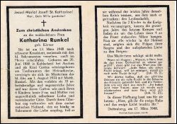 ∞ 1.8.1914 Matthias Runkel; 6 K., davon 2 †; in den letzten Jahren leidend; 4 Söhne kehrten aus dem Krieg zurück |