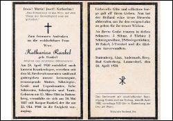 Mitgl. Mütterverein; ∞ 24.5.1887 Kaspar Runkel, † 25.10.1944; 9 überlebende Kinder |