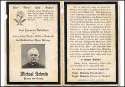Dreijährige Militärzeit; danach Theologiestudium; Priesterweihe Trier 26.3.1898; 2 J. in Nunkirchen tätig; richtete dann die neue Vikarie Heimbach a.d.Nahe ein; von dort 4 J. Pfarrer in Spang-Dahlem; seit 1915 Pfarrer in Beurig; im Namen der trauernden Angehörigen: Heinrich Schmitz, Ehrendomherr, u. Aegidius Schmitz, Pfarrer in Binsfeld |