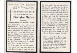 Teilnahme 1. Weltkrieg: EK II; Eltern: Joseph Kallen u. Adelgunde geb. Biermann; ∞ 29.10.1919 Maria Margaretha Küpper aus Delrath, Pfarre Nievenheim, † 27.4.1932; 3 K., davon 1 jugendl. †; große Sorgen lasteten auf ihm |