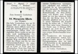Eltern: Adam Effertz u. Elisabeth geb. Virnich; Fräulein; nach dem Tod der Eltern blieb sie mit den Geschwistern zusammen; Hüterin der Rochuskapelle in Kaster; Druck in Bedburg/Erft |