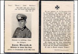 Gefallener 2. Weltkrieg; Eltern: August Munsbeck u. Agnes geb. Klein; seit 2 J. unter den Waffen; bei Merlosknoje b. Wjasma schwer verwundet, im Lazarett gestorben; Druck in Bergheim/Erft |