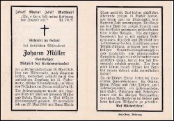Längeres Leiden; Gutsbesitzer; Mitgl. Kirchenvorstand; Eltern: Heinrich Müller u. Ursula geb. Fritt; ∞ 27.5.1905 Anna Maria Plum aus Lich; 15 K., davon 2 im Kindesalter †; |
