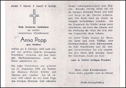Eltern: Hubert Schiffer u. Therese geb. London; ∞ 28.1.1910 Josef Popp; 3 K.; Druck in Bedburg/Erft |