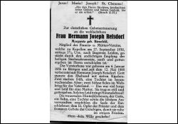 ∞ 12.5.1888 Hermann Joseph Reisdorf; 7 K., davon 3 †; 2 Söhne im 1. Weltkrieg gefallen; |