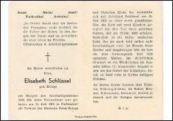Eltern: Peter Brings u. Christine geb. Klein; ∞ 22.5.1926 Gottfried Schlüssel, † 22.7.1958; 2 K.; Druck in Bedburg/Erft |