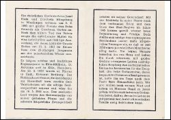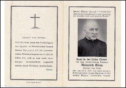 Eltern: Peter Josef Klein u. Elisabeth geb. Hüngsberg; Vater früh †; Priesterweihe 15.2.1913; Kaplan in Köln-Mülheim (St. Antonius) u. Köln (Herz-Jesu); 22.2.1933 Pfarrer in Esch, Dekanat Bedburg; Ausweisung durch die Nationalsozialisten am 16.5.1941, schwere körperliche Zwangsarbeit; nach 1945 Rückkehr in seine Pfarre, aber herzleidend; hatte deshalb seit 1950 priesterl. Mitarbeiter; die letzten Monate ans Haus gefesselt |