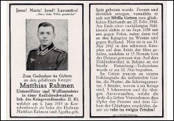 Gefallener 2. Weltkrieg; Heldenfriedhof b. Babino an der Straße Petersburg-Tschendoro; Eltern: Matthias Rahmen u. Agatha geb. Spix; ∞ 25.2.1941 Sibilla Gatzen; im Sept. 1939 nach Polen, dann Westen, dann Russland; Druck in Bedburg/Erft |