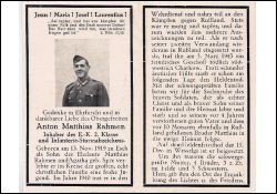 Gefallener 2. Weltkrieg; Eltern: Matthias Rahmen, vor 4 J. †, u. Agatha geb. Spix; zweimal verwundet; Bruder Matthias vor 10 Monaten gerfallen |