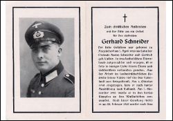 Gefallener 2. Weltkrieg; Eltern: Anton Schneider u. Gertrud geb. Valder; 1.10.1940 Einberufung; nach Russland; am 7.11.1941 an den Waldaihöhen verwundet; nach Genesung am 20.2.1942 wieder nach Osten; Ruhestätte b. Alekseewka am Tim; Druck in Hamel |