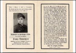 Gefallener 2. Weltkrieg; Eltern:Arnold Schnitzler u. Anna geb. Franzen; ∞ 3.3.1940 Margarethe Töller; bald darauf einberufen; Soldat in Frankreich, seit 20.6.1941 im Osten; am 4.3.1942 schwer verwundet; Ins Kriegslazarett Smolensk-süd verlegt; Heldenfriedhof Smolensk; Druck in Elsdorf |