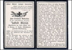 Gefallener 1. Weltkrieg; Einberufung 23.9.1916; eingesetzt bei Lille, Arras u. Cambrai; Febr. 1918 vier Wochen Heimaturlaub; beim Sturm gegen den Feind von Monchy nach Tilly tödlich verwundet; bereits 1914 u. 1916 waren zwei Brüder gefallen; 1 Bruder steht im Feld, 1 weiterer Bruder ist in London in Gefangenschaft; Druck in Düren |