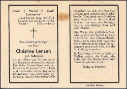 Während des Gottesdienstes am Himmelfahrtstag brach sie zusammen und starb; 31 J.; ∞ 25.9.1939 Mathias Lenzen; 2 K., davon 1 † |