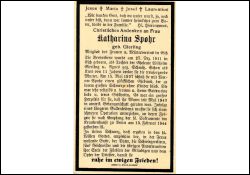 Mitgl. Mütterverein in Esch; Eltern: Wilhelm Gierling u. Agnes geb. Schmitz; Mutter †, als sie 11 J. alt war; ∞ 15.5.1937 Werner Spohr; kinderlos; Mann seit Mai 1943 in amerikan. Kriegsgefangenschaft; starb an Folgen einer Gallenoperation; Druck in Elsdorf |