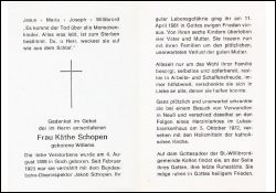 ∞ Bundesbahn-Oberinspektor Jakob Schopen, † 11.4.1961; 6 K., davon 2 †; erkrankte beim Besuch von Verwandten in Neuss; Friedhof der St.-Willibrordgemeinde Kellen |
