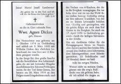 ∞ 5.3.1892 Wilhelm Dickes, † 28.3.1919 infolge eines Kriegsleidens (Gefallener 1. Weltkrieg); 11 K., davon 6 †; schwere Krankheit in den letzten Lebensjahren |
