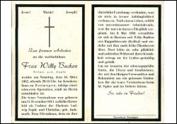 ∞ 9.5.1950 Willy Buchen (aus Ruppichterode), lebte in Köln-Thenhoven, Eltern: Ludwig Zapfe und Christine geb. Jackmuth; infolge einer schweren Operation verstorben |