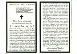 Eltern: Anton Harff u. Christine Hubertine geb. Odenthal; Gymn. Opladen; Studium Medizin; Praxis Neumagen/Mosel; ∞ 16.8.1938 Maria Rom, Würzburg, 1 Sohn, 1 Tochter; bestattet in Worringen |