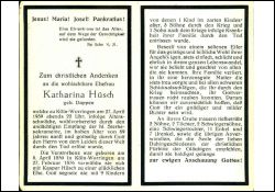 ∞ 27.2.1876 Kaspar Hüsch, 9 Kinder, davon 1 jung †, 3 Söhne Gef. Krieg †, 1 Sohn † (2 Söhne, 2 Töchter verblieben) |