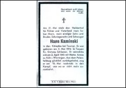 Gefallener 2. Weltkrieg; ∞ 2.4.1940 Maria Annas (Worringen); Todesjahr nicht bekannt; "aus dem Polenfeldzug .. zurückgekehrt, zog er am 10. Mai nochmals in den Kampf, von wo er nicht mehr zurückkehrt." |