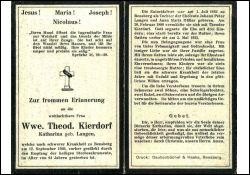 Eltern: Johann Peter Langen und Anna Maria Müller; ∞ 20.2.1886 Theodor Kierdorf † 2.5.1925; 2 Söhne, 1 Kind †; Druck Totenzettel in Bensberg |