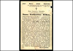 Eltern: Paul Köllen und Helena geb. Alberts; 1 Bruder, 1 Schwester (mit der sie zusammenlebte); Lungenentz.; Totenzettel beschädigt, Todesdatum nicht mehr kompl. zu entziffern |