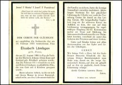 Eltern: Johann Adam Zons und Gertrud geb. Kleefisch; ∞ 24.2.1911 Hubert Lämbgen; 4 Kinder; Totenzettel Druck in Lechenich |