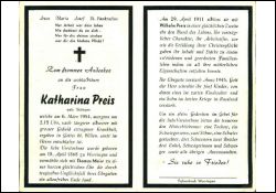 ∞ Thomas Meier † (Unfall); ∞ 29.4.1911 Wilhelm Preis † 1944; 5 Kinder, davon 1 Kind jung † und 1 Sohn † Gefallener 2. Weltkrieg (2 Söhne, 1 Tochter verblieben) |