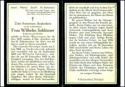 ∞ 14.9.1895 Wilhelm Schlömer † 30.9.1925; 2 Söhne, 1 Tochter; 1 Sohn 7 Jahre alt †; 1 Sohn Clemens † 20.9.1928 Opfer 1. Weltkrieg |