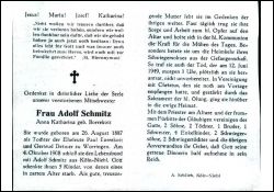 ∞ 4.10.1908 Adolf Schmitz (Köln-Niehl); 5 Kinder, davon 1 jung † (2 Söhne, 2 Töchter verblieben) |