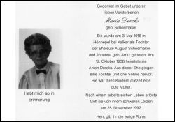 Eltern: August Schoemaker u. Johanna geb. Arntz; ∞ 12.10.1938 Anton Dercks; 4 K. |