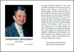 Eltern: Fritz Heusgen und Maria geb. Herriger; ältere Geschwister: Edmund u. Leni; ∞ 1953 Bernhard Thywissen (Weilerswist) |