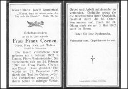 ∞ 24.2.1897 Franz Bartholomäus Coenen aus Elmpt, † 21.12.1925; Druck in Dülken-Waldniel |
