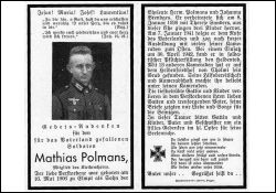 Gefallener 2. Weltkrieg; Mitgl. Kirchenchor; Eltern: Hermann Polmans u. Johanna geb. Brendges; ∞ 8.1.1936 Therese Sanders; 3 K.; 7.1.1941 Einberufung zur Wehrmacht; Heldenfriedhof Cholmi; Druck inm Brüggen, Rhld. |