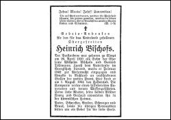 Gefallener 2. Weltkrieg; Eltern: Wilhelm Bischofs u. Gertrud geb. Tillmanns; zunächst im Grenzschutz; seit Febr. 1942 Wehrmacht |