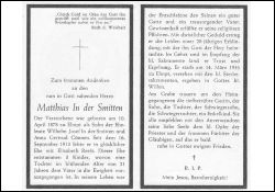 Eltern: Wilhelm Josef In der Smitten u. Anna Gertrud geb. Cünnen; ∞ 16.9.1913 Elisabetrh Reefs; 3 K., davon 1 Tochter mit 21 J. †; 20-jährige Erblindung; |