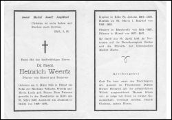 Eltern: Wilhelm Weertz u. Maria Luzia geb. Bonus; Priesterweihe Köln 31.3.1900; Assistent am Alumnat in Brühl 1900-01; Kaplanan St. Johann in Köln 1901-03; Kaplan an St. Maria im Kapitol in Köln 1903-11; Pfarrer in Ründeroth 1911-27; Pfarrer in Hersel 1927-1947 |