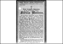 ∞ 16.11.1857 Franz Welters, † 2.9.1876; einzige Tochter Josephine † 3.6.1882; einziger Sohn Silhelm † 11.9.1885 |