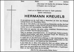 Eltern: Ludwig Kreuels u. Magdalene Bluhm; ∞ 20.8.1935 Anna Kluth aus Helpenstein; 3 K.; Schuhmachermeister; Kirchenvorstandsmitgl.; Brudermeister (u.a. bei Bergheimer Prozession) |