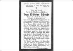 Mitgl. Mütterverein; Eltern: Johann Tillmanns u. Anna geb. Veger; ∞ in Elmpt 23.11.1907 Wilhelm Bischofs; 5 K., davon Sohn Frnz †; Druck in Brüggen, Ndrh. |