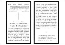 Eltern: Gottfried Schneider u. Therese geb. Bess; ∞ 24.6.1954 Katharina Coenen; 1 Sohn; Opfer des 2. Weltkrieges; kehrte am 30.8.1949 schwer krank aus russischer Kriegsgefangenschaft zurück und starb an den Folgen |