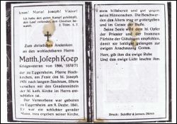 Kriegsveteran von 1866 und 1870/71; Verwalter auf dem Heuserhof in Oberbolheim; langes Siechtum; er starb im Haus seiner Schwester Konstanze Krudewig in Eggersheim; ledig; unehelicher Sohn: Josef Kentenich, geb. 16.11.1885, später Pallottinerpater und Gründer der Internationalen Schönstattbewegung; benannt nach seiner Mutter Katharina Kentenich |