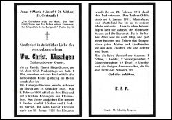 ∞ 2.2.1894 Christian Körschgen aus Oberaußem, † 24.2.1940; 8 K.; Sohn Kaspar Christian † 18.1.1939; Druck in Kerpen |