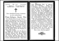 19-lähriges Gichtleiden; Eltern: Heinrich Schmitz u. Agnes geb. Felten; ∞ 2.5.1891 Johann Andreas Nix, Sohn von Peter Joseph Nix u. Maria Katharina geb. Linartz aus Rosellerheide; 7 K., davon 1 Sohn früh †, 1 Tochter mit 16 J. †, 1 Sohn im 2. Weltkrieg gefallen |